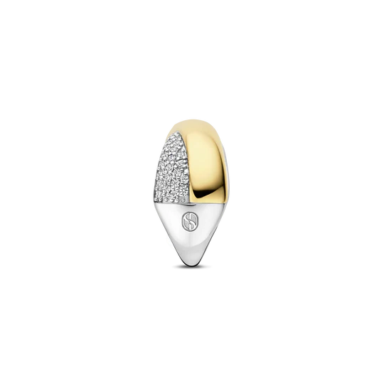 Cette bague crossover en zircone audacieuse est fabriquée en argent sterling 925/1000 de haute qualité et présente un design sculptural puissant. La bague se compose d’anneaux qui se croisent, l’un fini en plaquage or lisse en 18 carats et l’autre orné de pierres de zirconium étincelantes. Le contraste entre la bande polie et élégante et la zircone scintillante ajoute de la profondeur et donne à la bague une présence distinctive. Cette bague de remarque attire vraiment l’œil. Portez-la seul comme un accent audacieux ou combinez-la avec d’autres bagues pour un look superposé. Le design crossover fait de cette bague un élément fort et reconnaissable de la collection, adaptée aussi bien au style quotidien qu’aux occasions plus expressives.
