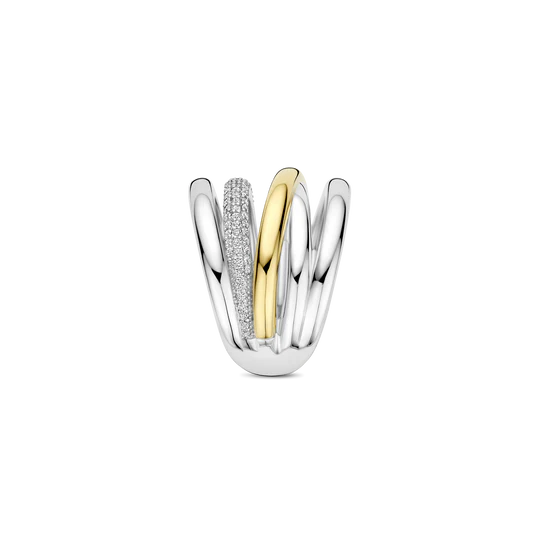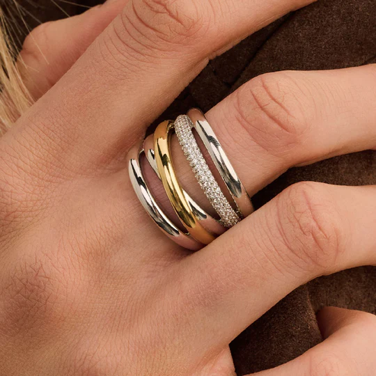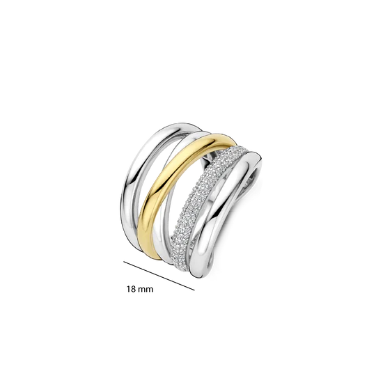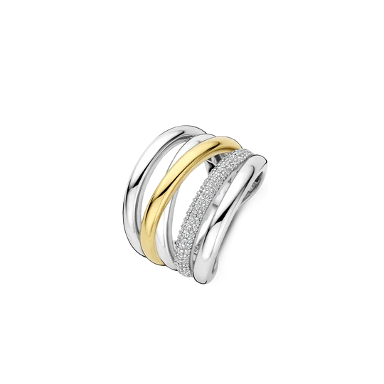 Cette bague est fabriquée en argent sterling 925/1000 de haute qualité et présente un design audacieux et superposé. La bague est composée de plusieurs bandes avec un espace entre elles, créant un effet ouvert et aérien. Une bande est finie par une couche de 18 carats plaquée or, tandis qu’une autre est sertie de pierres de zirconium. La combinaison de surfaces lisses, de tons dorés chauds et de détails scintillants confère à l’anneau une profondeur et une présence distinctive. Grâce à sa structure ouverte, cette bague d’affirmation se démarque sans paraître lourde. Portez-la seul comme un accent marqué ou combinez-la avec d’autres bagues pour un look superposé.