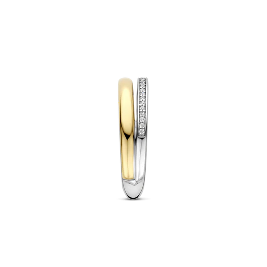 Célébrez l’équilibre moderne avec cette bague en argent plaqué or TI SENTO 12392ZY. Confectionné en argent 925/1000, ce design élégant présente deux bandes distinctes fusionnées en un ensemble sculptural : une courbe plaquée or jaune polie et un arc plaqué platine pavé de zircons cubiques blancs taille brillant. Le contraste entre un éclat doux et un éclat vif crée un jeu raffiné de tons et de textures. Portez-le seul ou associez-le aux boucles d’oreilles assorties pour un look harmonieux et sculptural. Sans nickel et hypoallergénique, cette bague offre une brillance durable et un confort sans effort tout au long de la journée.
