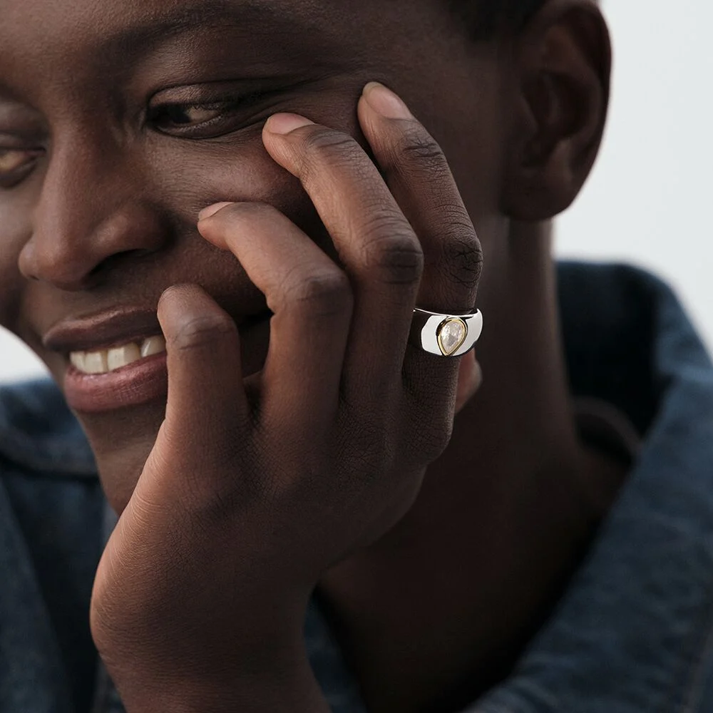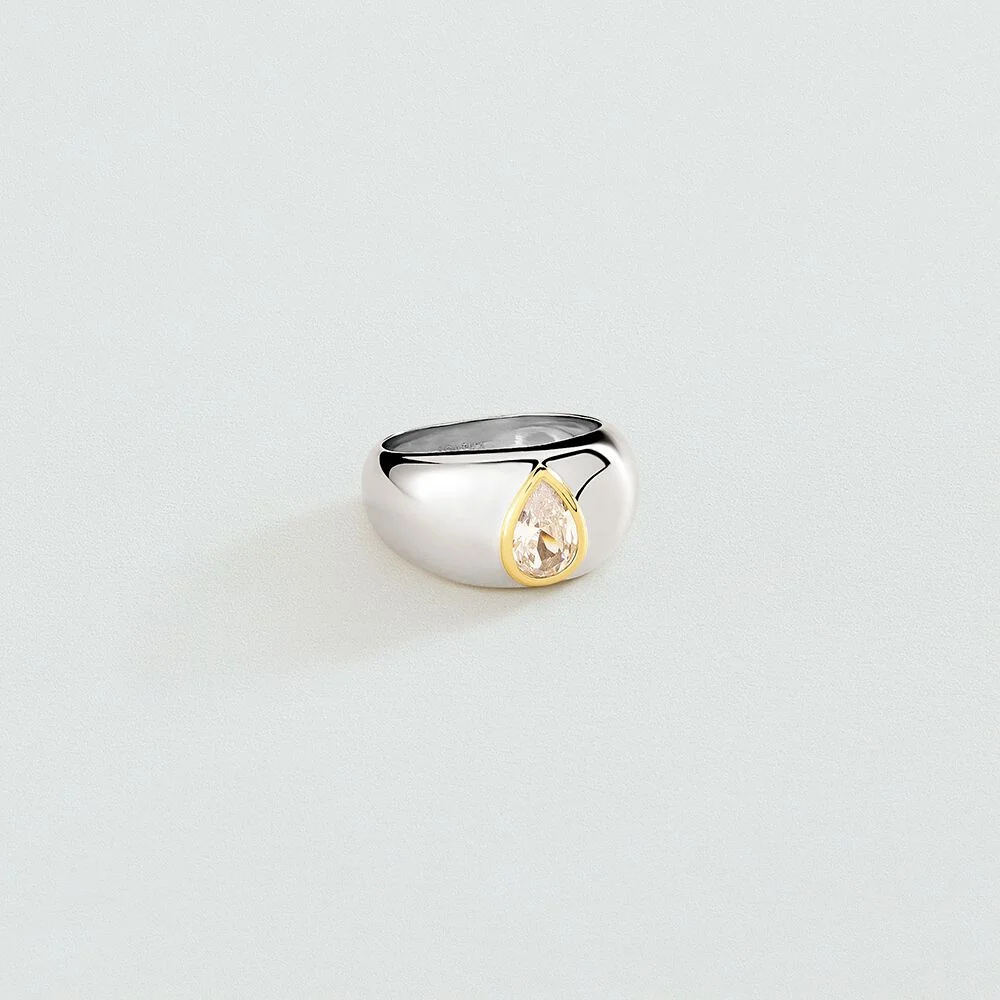 Bague bombée, en laiton rhodié, oxyde de zirconium en forme de poire souligné par une bordure en laiton doré 750/1000.