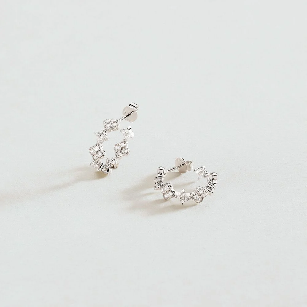 Créoles en argent 925/1000 faites de rangées de fleurs pavées d’oxydes de zirconium. Fermeture par des poussettes en argent.