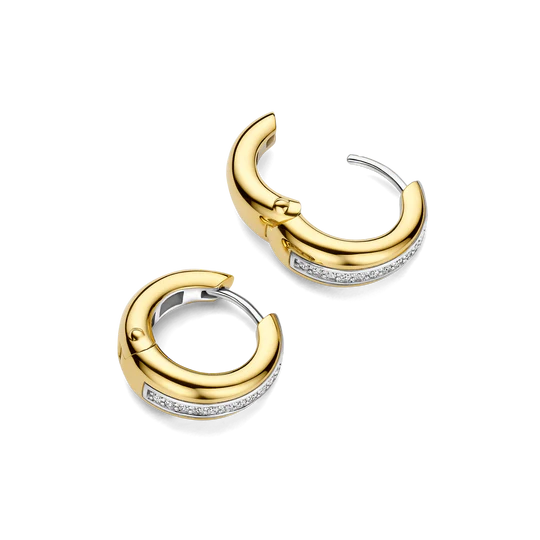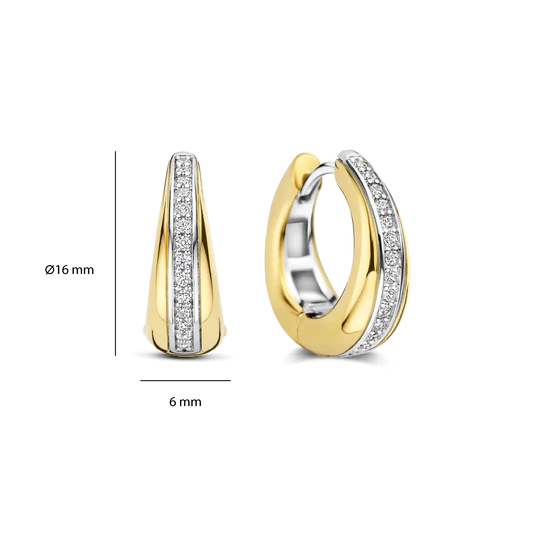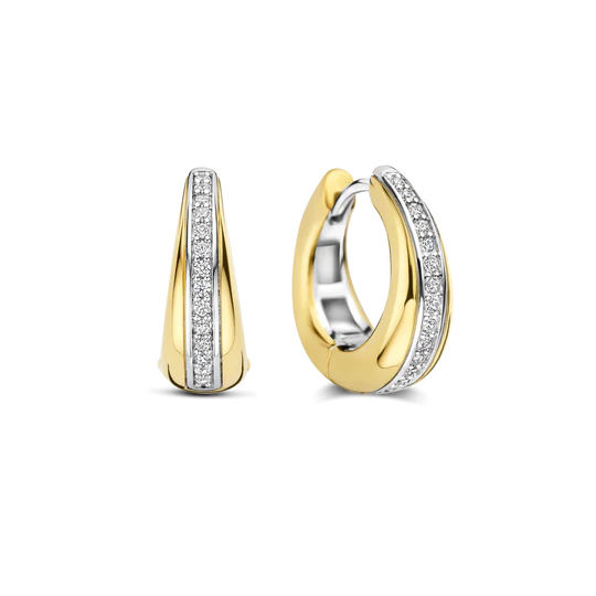 Les créoles en zirconium stratifié sont fabriqués en argent sterling 925/1000 de haute qualité et finis avec un revêtement plaqué or 18 carats. Ces anneaux s’élargissent subtilement vers le bas, créant une silhouette superposée et assurée. Une rangée raffinée de pierres de zircone soigneusement posées traverse le centre, captant magnifiquement la lumière à chaque mouvement. Avec un diamètre de 16 mm, ils trouvent l’équilibre parfait entre élégance et audace.