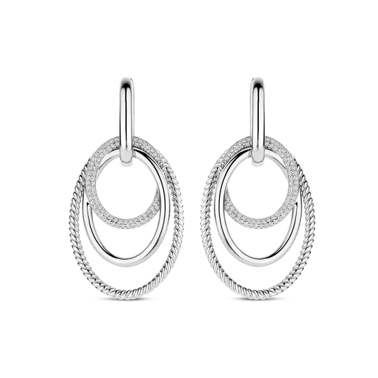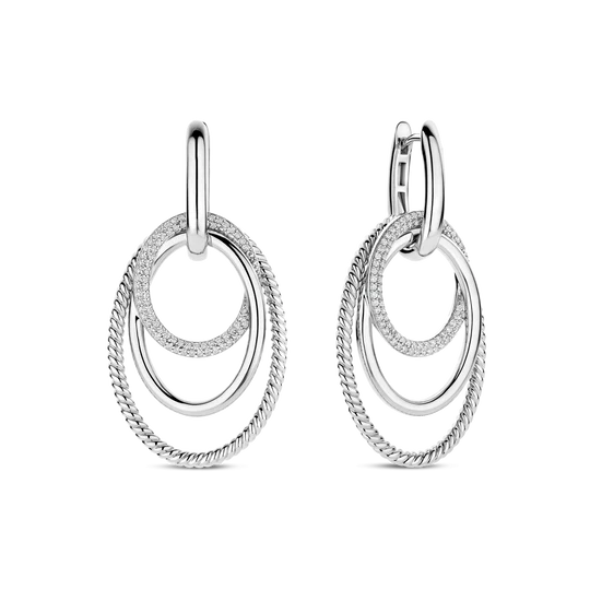 Ces créoles sont des boucles d’oreilles remarquables fabriquées en argent sterling 925/1000 de haute qualité. La créole comporte trois anneaux plus grands entrelacés, chacun avec son propre caractère : un anneau à texture nervurée et torsadée, un avec une finition argentée lisse, et un serti de pierres de zirconium. L’espace ouvert entre les anneaux crée un design en couches avec profondeur et contraste.