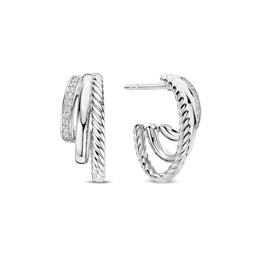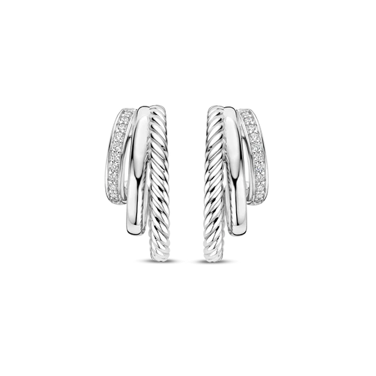 Ces boucles d’oreilles en structure en zirconium sont fabriquées en argent sterling 925/1000 de haute qualité et se composent de trois anneaux de différentes tailles, chacun avec sa propre texture. Une bande est lisse, une autre présente une texture nervurée, et une est sertie de pierres de zirconium soigneusement placées. La combinaison des structures crée de la profondeur et un jeu de lumière raffiné, tandis que le zircone capte subtilement la lumière à chaque mouvement.