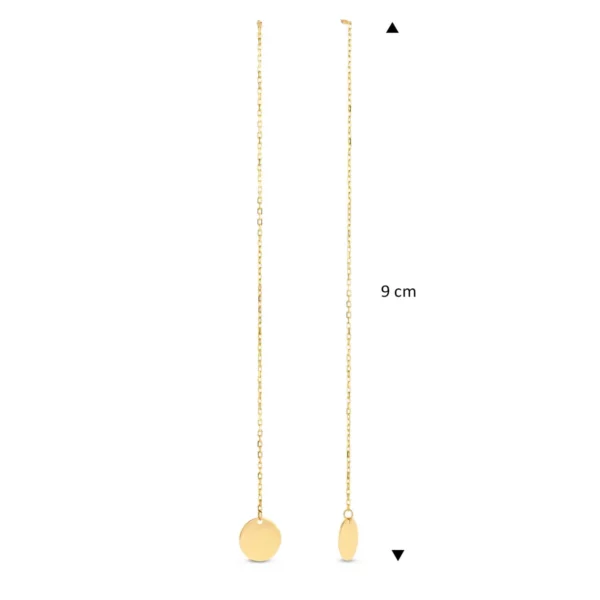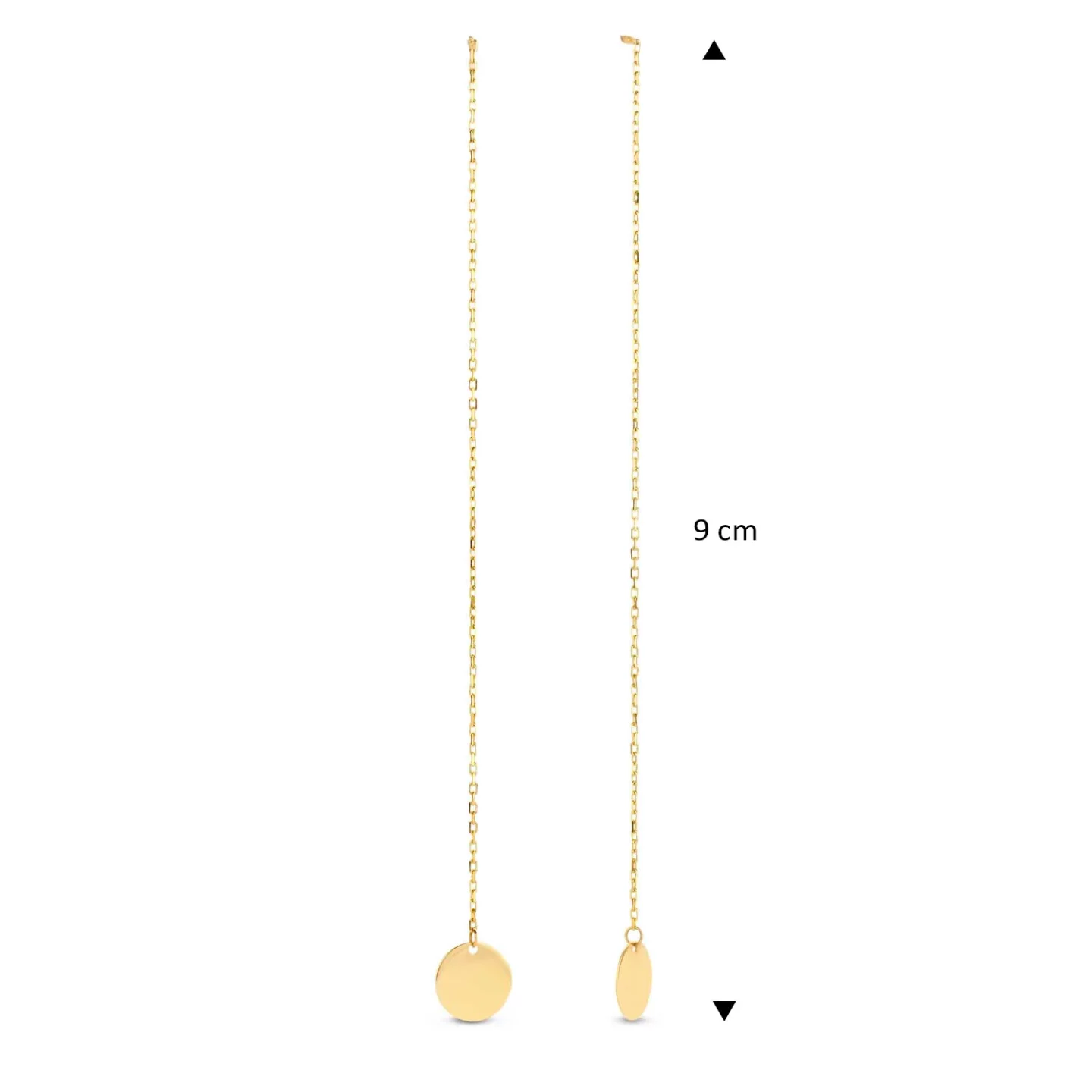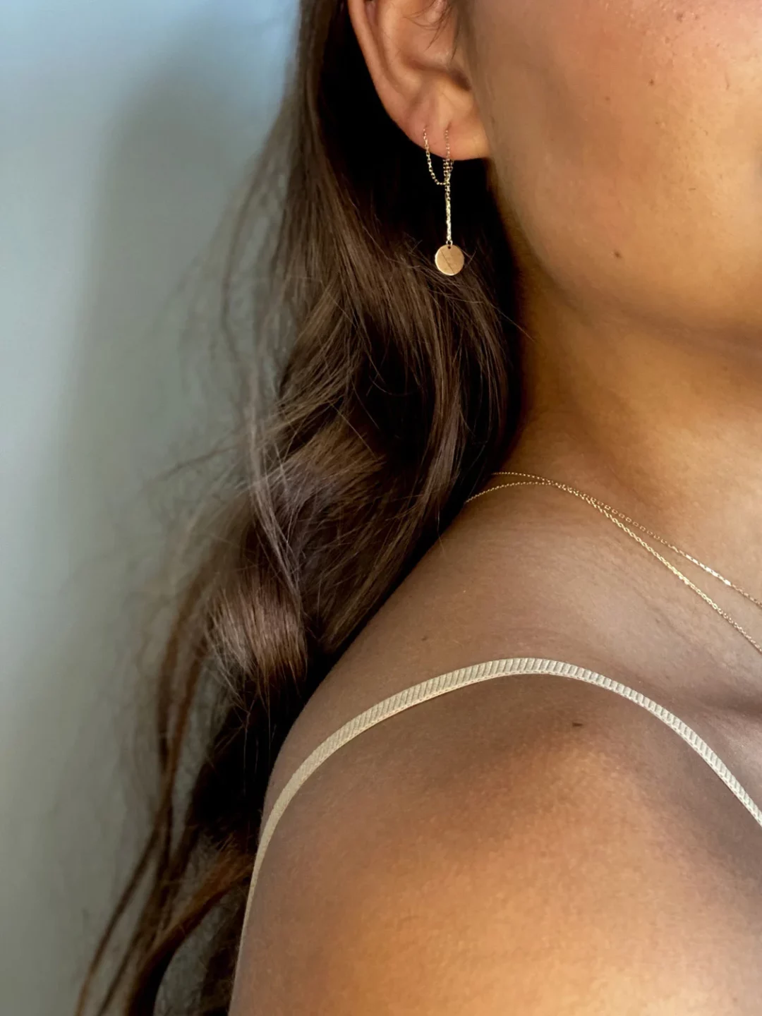 Les boucles d'oreilles Disc Threader sont en or 14 carats et peuvent être portées de différentes manières. Portez-les de manière classique à travers un trou ou créez un effet ludique en les passant à travers plusieurs trous. chaine de 9cm de long.
