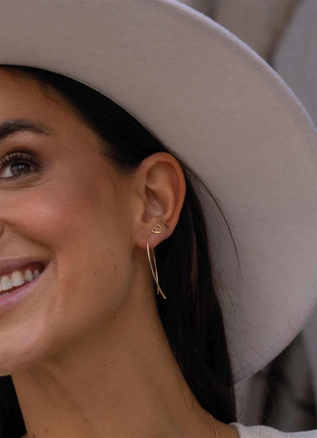 Ce sont mes boucles d'oreilles Mayfair en or 14 carats. Les boucles d'oreilles sont des ovales épurés avec des extrémités pointues. Elégantes, raffinées et faciles à assortir avec les autres bijoux Jackie en or 14 carats !