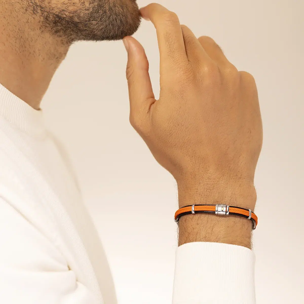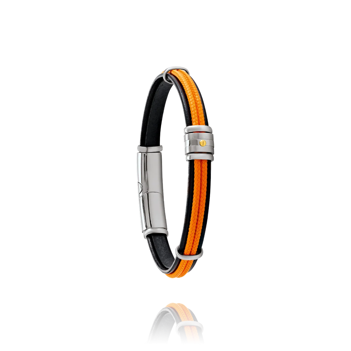 Le bracelet AMARO de JOURDAN Bijoux est conçu pour l’homme moderne qui cherche à allier force et subtilité. Ce bijou unique combine la robustesse du cuir et la douceur d’une cordelette orange, créant un contraste saisissant qui ne manquera pas de se faire remarquer. La touche finale est apportée par une vis en or 18 carats, ajoutant une note de luxe discrète. Le bracelet AMARO s’adapte à toutes les occasions, que ce soit pour rehausser une tenue décontractée ou pour apporter une touche d’audace à un look plus formel. Sa qualité et son design intemporel en font un investissement durable. C’est l’occasion de vous offrir un bijou qui vous ressemble. Longueur réglable.