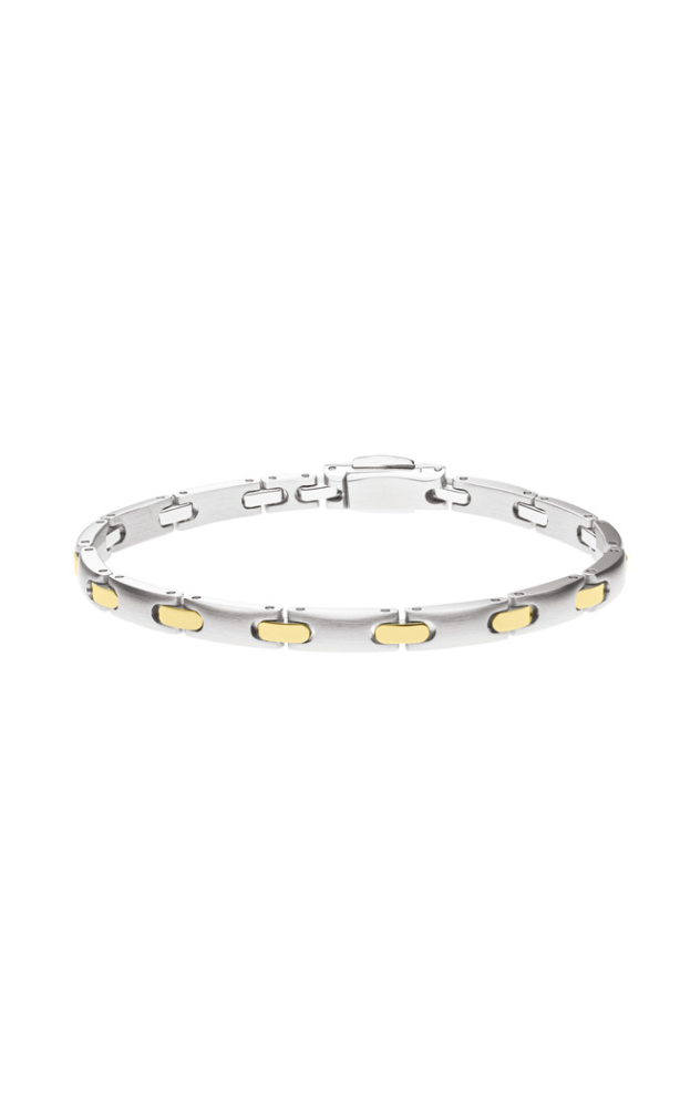 Bracelet acier et or mat et poli de 5mm de large, fermeture double cliquet.