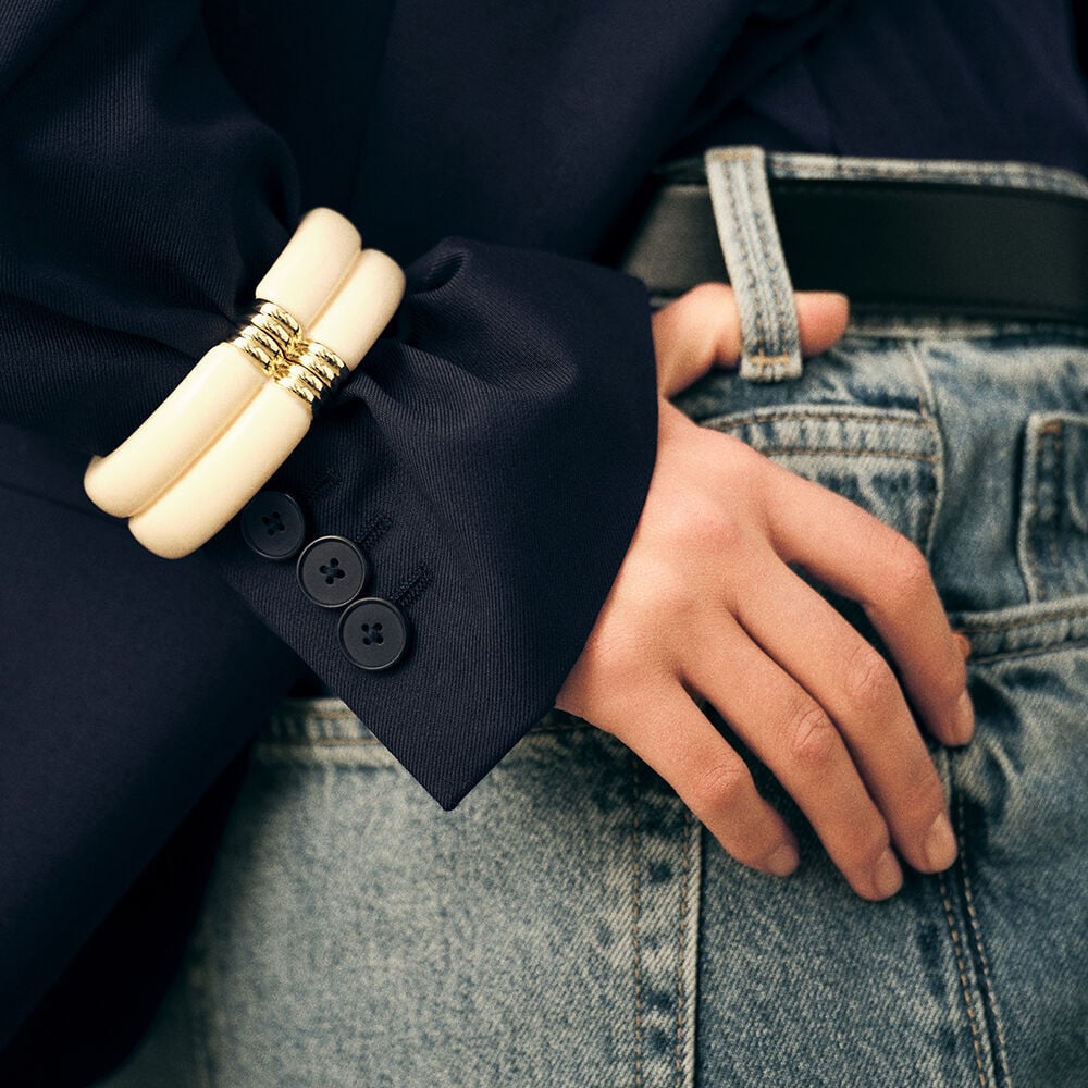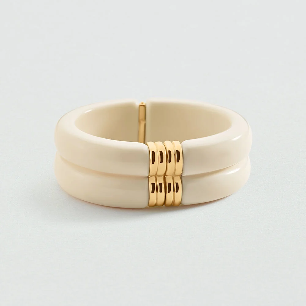 Manchette articulée double rang en acétate blanc cassé et laiton doré à l’or 750/1000. Diamètre de 60mm, ouvrant avec un ressort.
