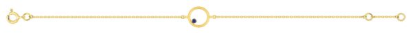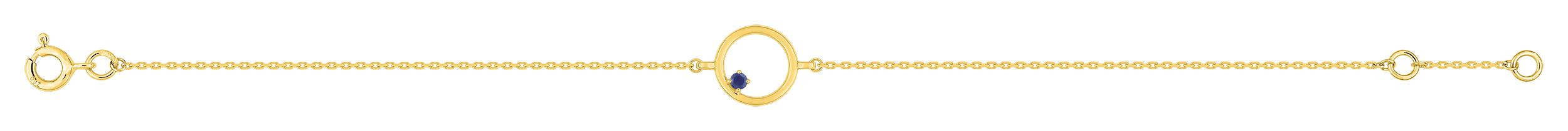 Bracelet or jaune 750/1000 maille forçat avec un petit cercle au centre et un saphir rond griffé, longueur 18 cm avec un anneau de réglage à 16.5cm, fermeture anneau ressort.