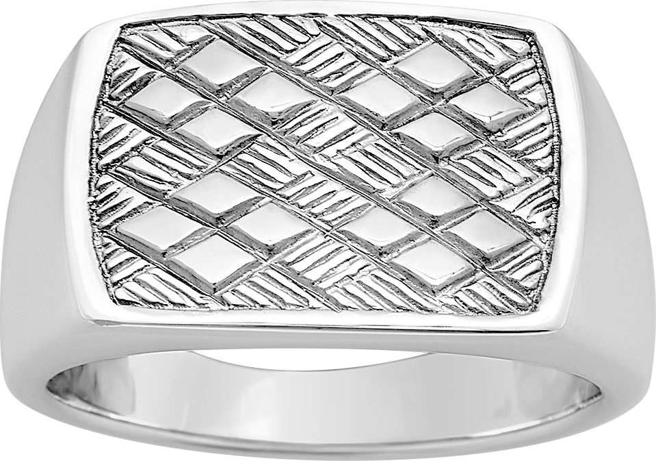 Chevalière en argent massif 925/1000 rhodié de forme rectangulaire, dessus quadrillé de losanges et le corps est poli.