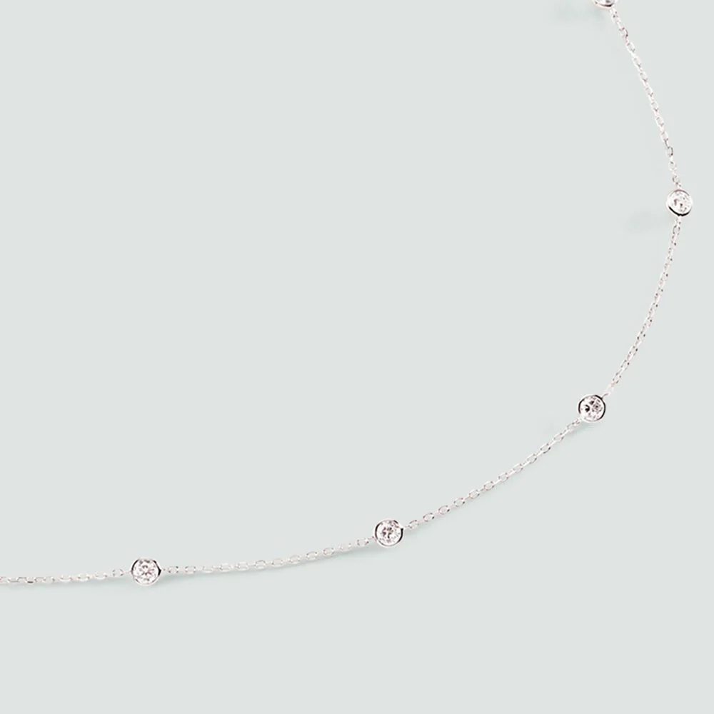 Sautoir en argent 925/1000 serti d’une multitude d’oxydes de zirconium. . Ce bijou mesure 70 cm auquel s’ajoute une rallonge de 5 cm.