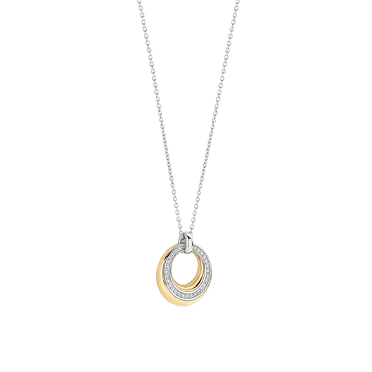 Ce collier en argent, avec un pendentif circulaire plaqué or 18 carats, est fabriqué en argent sterling 925/1000 de haute qualité et présente un design raffiné et intemporel. Le pendentif circulaire est fini dans un ton or chaud et serti d’une rangée de pierres en zirconium qui offrent un éclat subtil. Le centre ouvert ajoute de la profondeur et met en valeur le caractère léger et élégant de la pièce. La chaîne argentée crée un aspect équilibré, permettant au pendentif de reposer magnifiquement sur l’encolure.