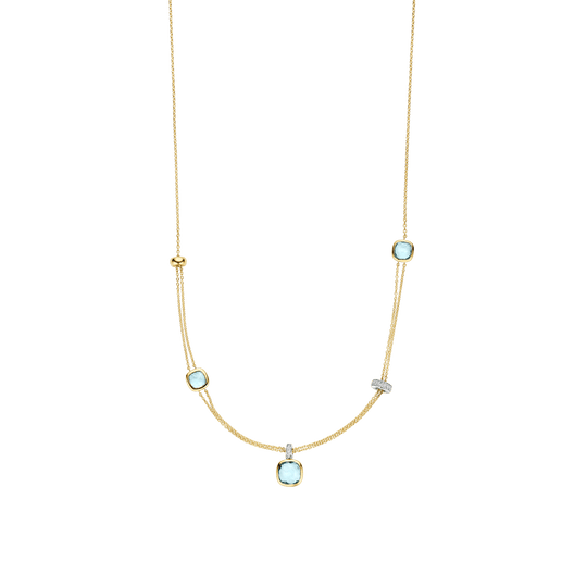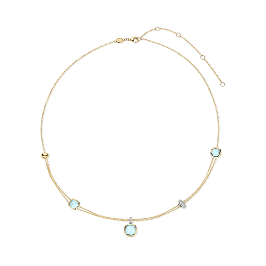 La combinaison de la teinte bleue fraîche, de la finition dorée chaude et du zircone étincelant crée un jeu de lumière vibrant. La fine double chaîne et le design en couches rendent ce collier coussin facile à combiner avec d’autres colliers plaqués or ou argent, tout en lui permettant de se dresser parfaitement seul comme point focal raffiné. 34122TY/50 Coussin & Collier