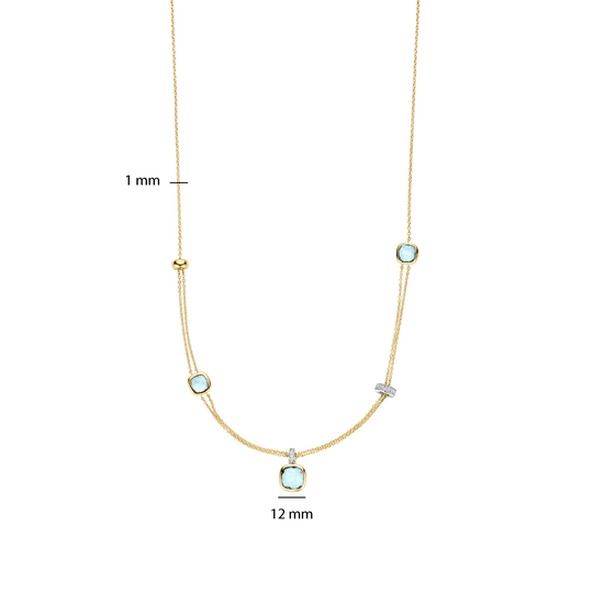 Ce collier vermeil en or 18 carates avec des pierres coussins bleues est fabriqué en argent sterling 925/1000 de haute qualité et présente un design raffiné et superposé. Le collier est orné d’une double chaîne et enrichi de détails subtils tels qu’un petit cercle en zirconium, un cercle plaqué or et plusieurs pierres coussins bleues. Au centre, une pierre bleue taillée en coussin est sertie dans un serti vermeil or 18 carats et fixée avec un détail serti en zircone pour un raffinement supplémentaire. Les pierres translucides réagissent subtilement à différentes conditions de lumière et teints de peau, permettant à la teinte bleue d’apparaître légèrement différente selon chaque porteur et dans chaque serti.