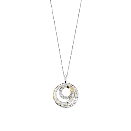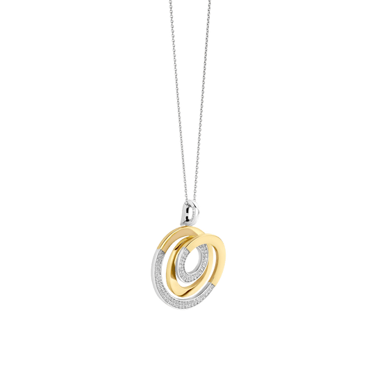 Laissez-vous tenter par l’éclat sculptural avec ce pendentif en argent plaqué or TI SENTO 6851ZY. Confectionné en argent 925/1000, ce pendentif est orné de deux cercles entrelacés : l’un poli en or jaune éclatant, l’autre plaqué platine et pavé de zircons cubiques blancs taille brillant. Le design superposé crée une spirale raffinée de lumière et de contraste, symbolisant l’unité et le mouvement. Une élégante bélière plaquée platine suspend la pièce à votre chaîne préférée, parfaite pour ajouter de la profondeur à un look superposé ou portée seule comme un accent significatif. Sans nickel et hypoallergénique, il offre une brillance durable avec un confort léger comme une plume. Le pendentif est livré avec un délicat collier en chaîne argentée.