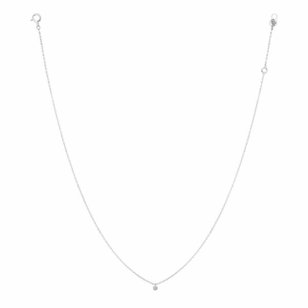 Collier or blanc 750/1000 et 1 diamant de 10/100, qualité GSI percé par un mini anneau et monté sur chaine forçat avec un anneau de réglage à 2cms