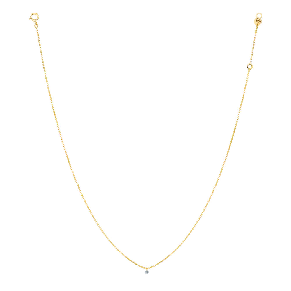 Collier or jaune 750/1000 et 1 diamant de 7/100, qualité GSI percé par un mini anneau et monté sur chaine forçat avec un anneau de réglage à 2cms