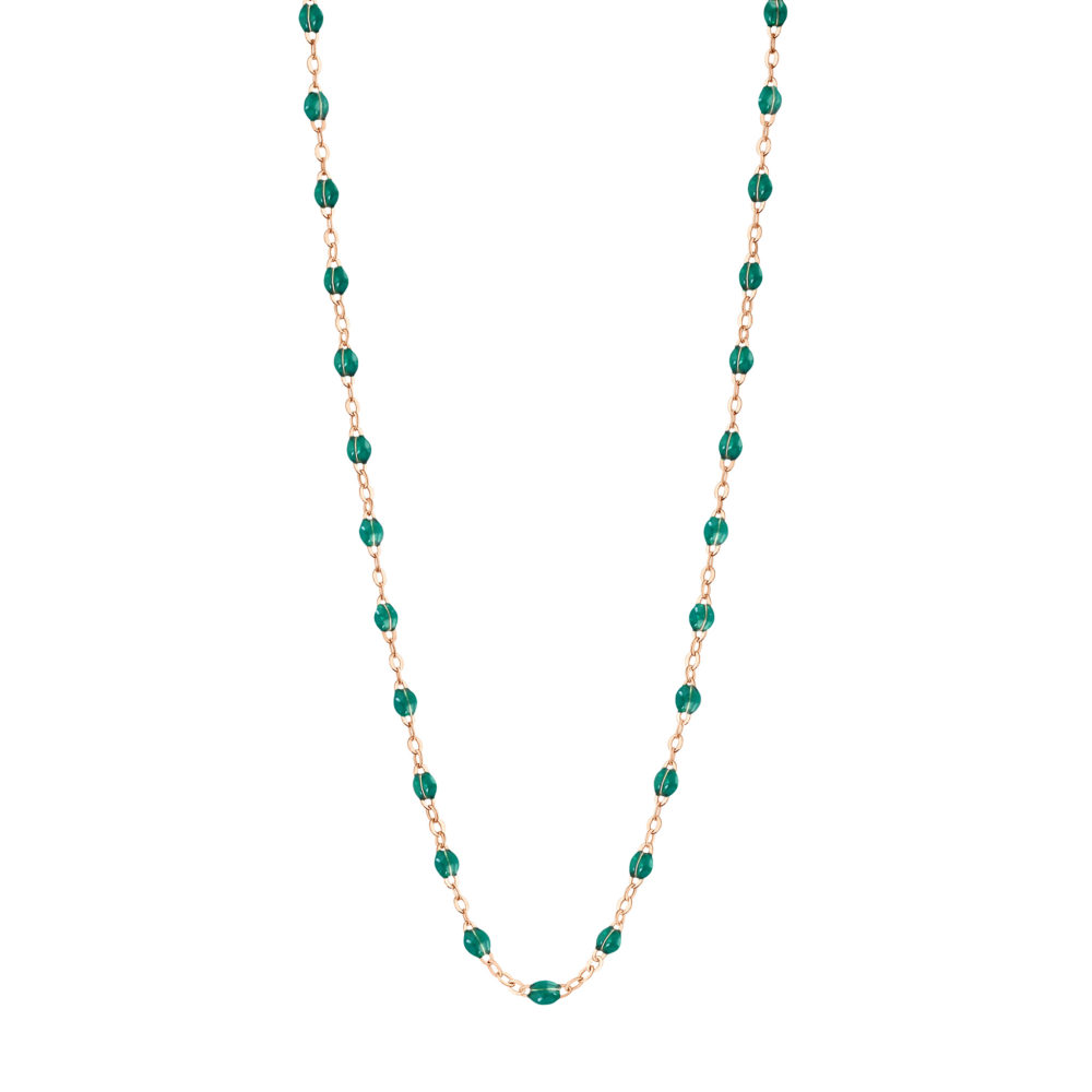 Collier gigi CLOZEAU maille en or rose 18 carats et perles de résine couleur vert émeraude, longueur de 50 cm avec un anneau de réglage à 2cm. Fermeture anneau ressort.