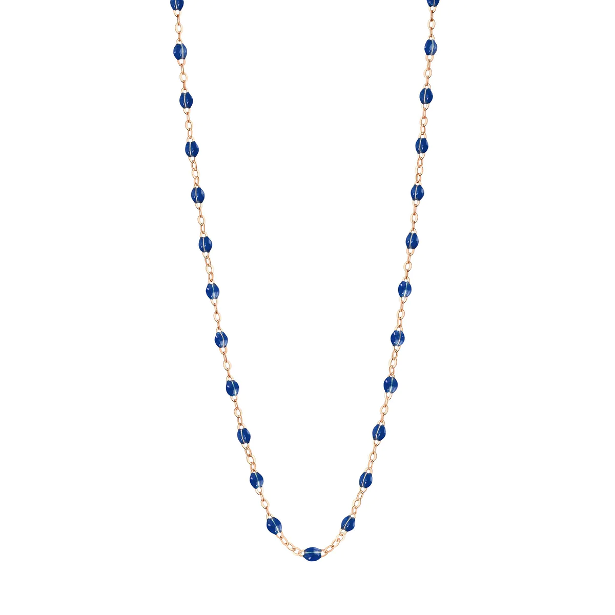 Collier gigi CLOZEAU maille en or rose 18 carats et perles de résine couleur bleu de prusse, longueur de 45 cm avec un anneau de réglage à 2cm. Fermeture anneau ressort.