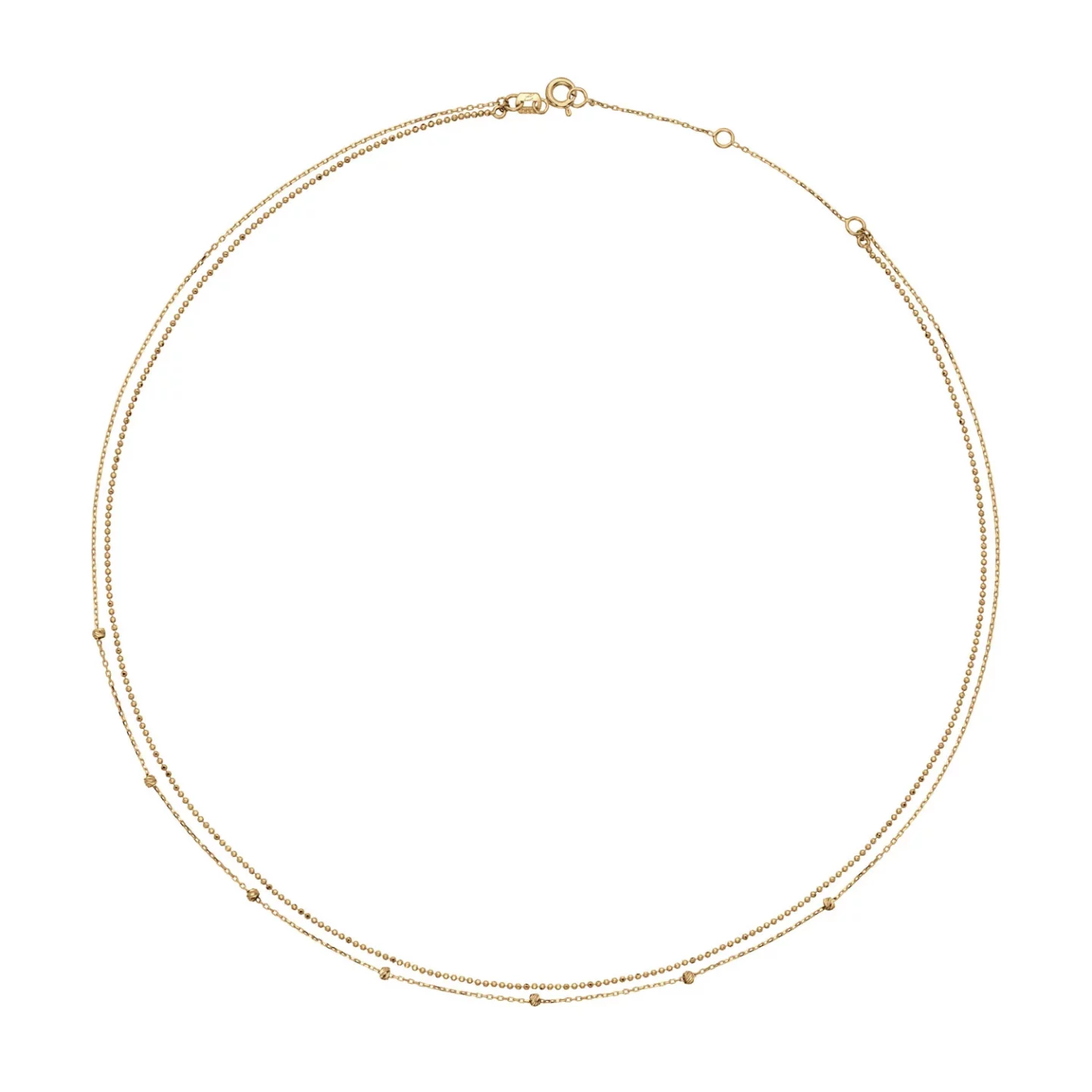 Avec ce collier en or 14 carats, vous avez tout de suite un parfait effet de superposition. Regardez bien les détails : une double chaine et sur une des petites perles sont facettées, ce qui leur permet de scintiller comme des diamants sous la lumière du soleil. Longueur de 45cm avec 3 anneaux de réglage. Fermeture par un anneau ressort.
