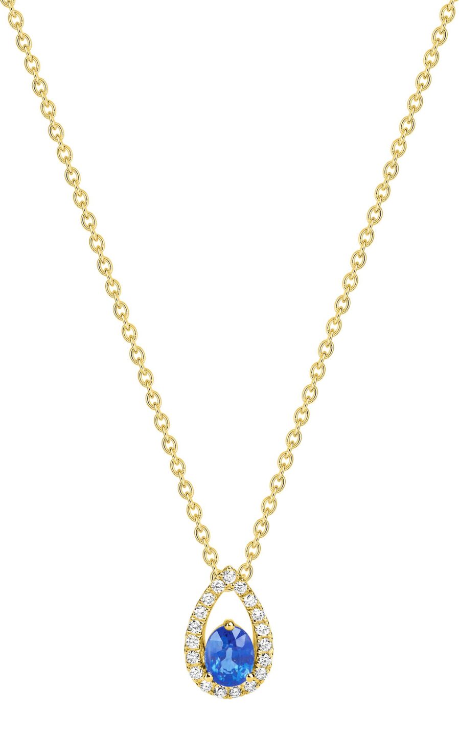 Chaine en or jaune 750/1000 avec un pendentif qui coulisse. Saphir de Ceylan de 5X4 entouré de diamants dans une forme poire pour un poids total de 11/100 en qualité GHSI. Fermeture par un mousqueton, longueur 42cm avec un anneau de réglage à 2cm.
