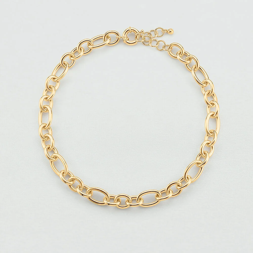 Collier court, en laiton doré 750/1000, chaine épaisse anneaux ovales et ronds. Ce bijou mesure 42cm et contient une rallonge de 5cm. Fermeture par un anneau ressort boué en plaqué-or.