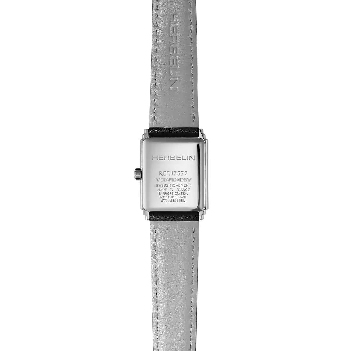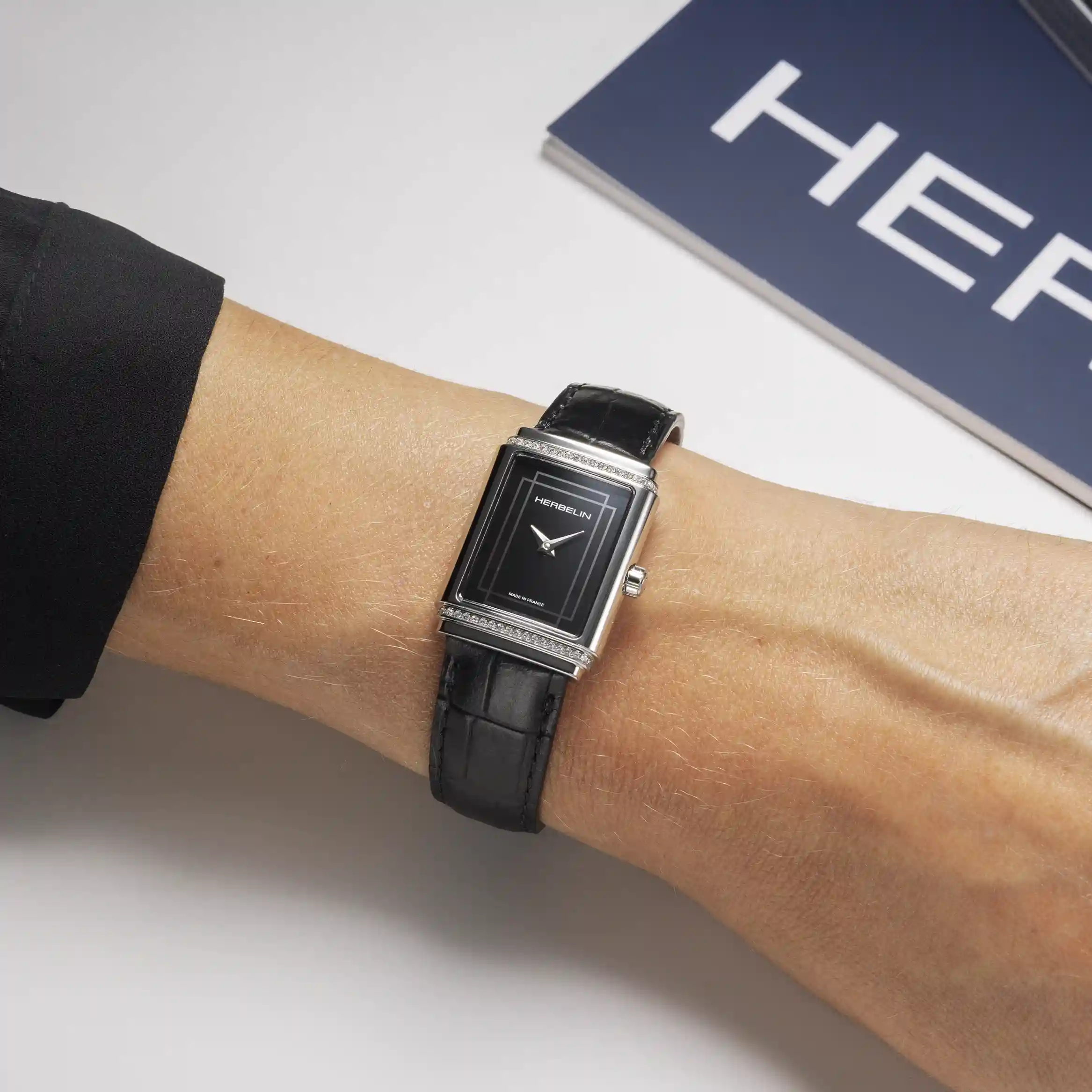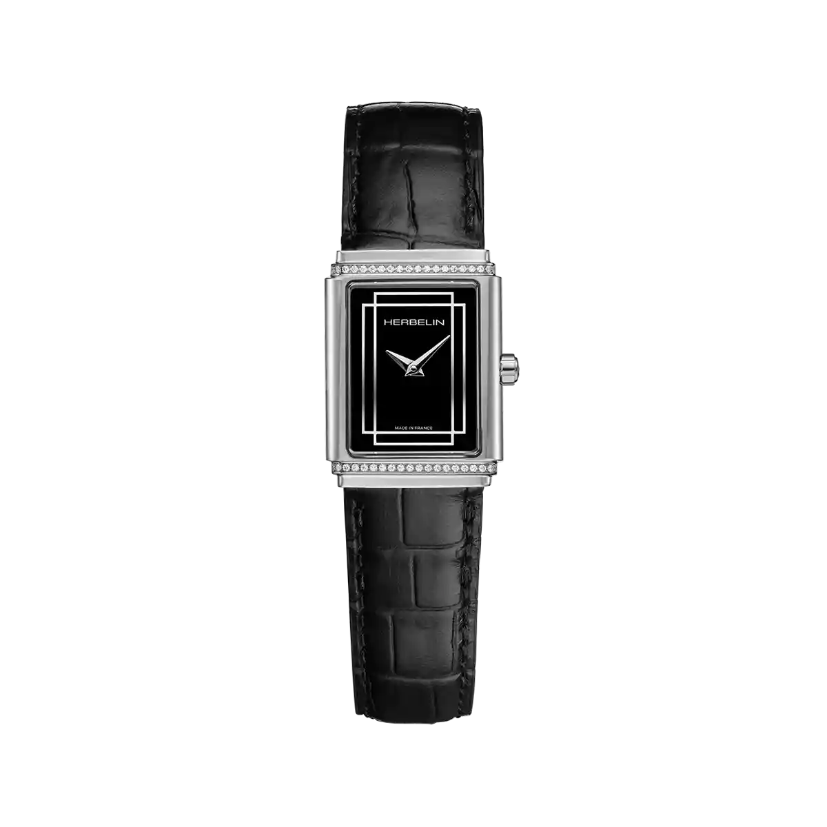 ART DÉCO 1925’S cadran noir rend hommage à l’élégance architecturale des années folles. Fidèle au savoir-faire de la Maison Herbelin, créateur français depuis plus de 50 ans, cette montre s’impose comme une véritable montre-bijou. Son boîtier rectangulaire en acier inoxydable 316L, orné d’une ligne de véritables diamants sertis avec finesse, encadre un cadran noir profond aux lignes graphiques inspirées de l’Art Déco. Protégée par un verre saphir et étanche à 30 mètres, elle conserve une finesse de 6,4 mm qui souligne son raffinement. Équipée d’un mouvement quartz suisse Ronda 751, elle offre précision et fiabilité au quotidien. Son bracelet en cuir noir alligator, doté d’une boucle traditionnelle, parachève son allure élégante et intemporelle. ART DÉCO 1925’S est une montre-bijou pensée pour les femmes en quête de distinction et de sophistication.