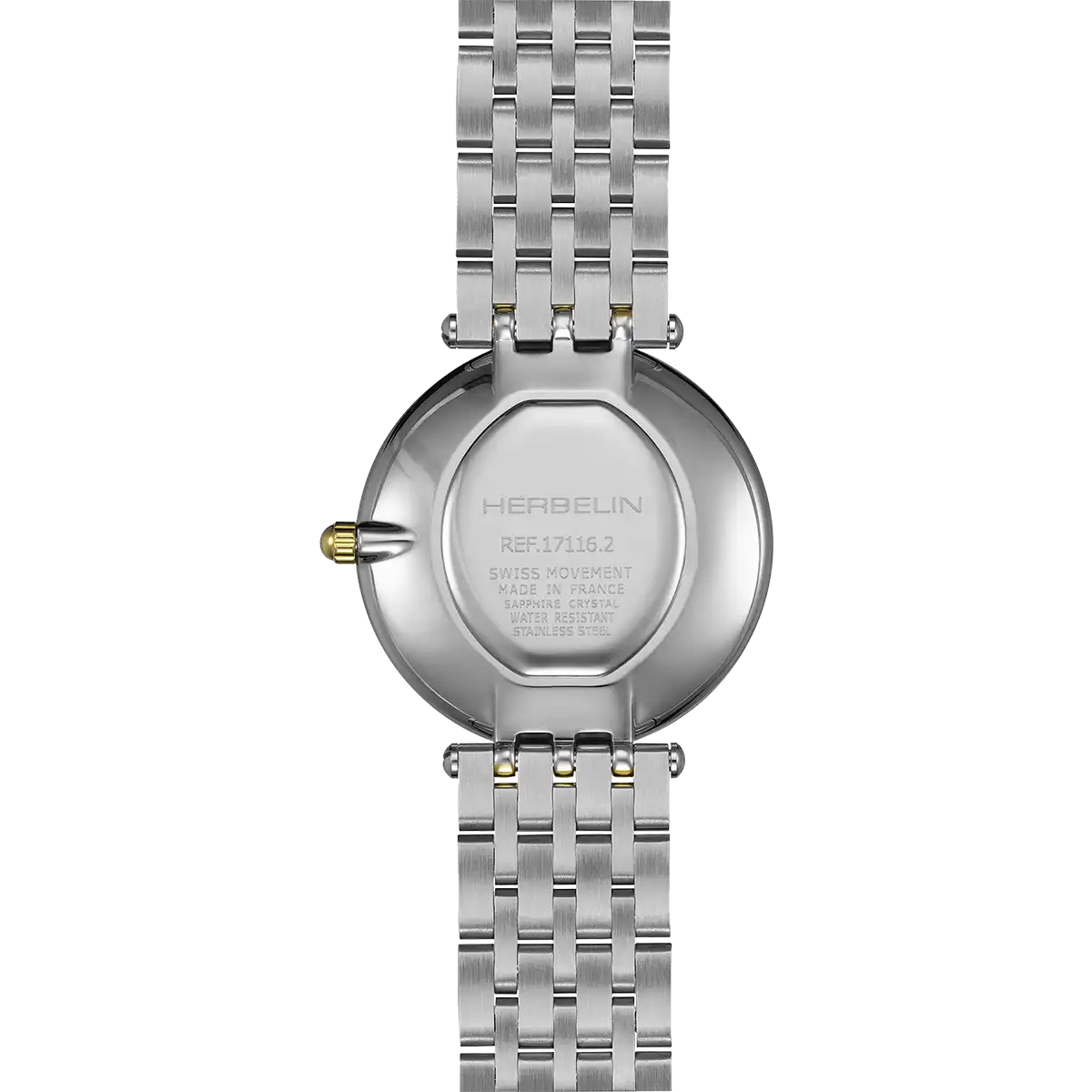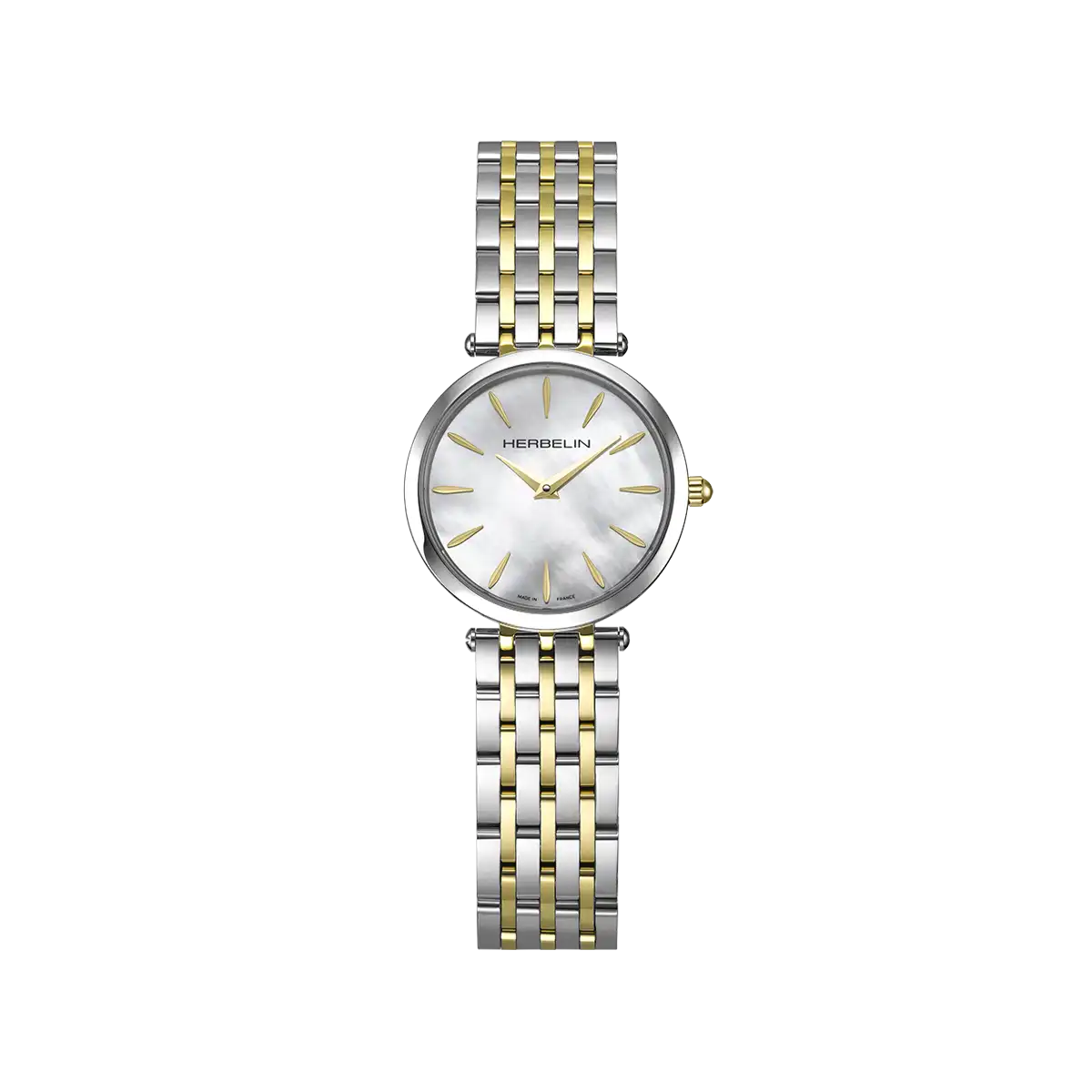 Élégante et délicatement lumineuse, la montre Epsilon Quartz Nacre & Acier / PVD Or incarne une interprétation raffinée de l’horlogerie féminine selon HERBELIN. Son boîtier rond en acier inoxydable 316 L, sublimé par des touches de PVD or jaune, offre un contraste harmonieux entre modernité et chaleur, parfaitement équilibré par un diamètre de 28 mm et une finesse remarquable. Le cadran en nacre blanche véritable révèle des reflets irisés uniques, apportant douceur et profondeur à l’ensemble. Les index et aiguilles dorés soulignent avec élégance la pureté du cadran, assurant une lecture claire des heures et des minutes, protégées par un verre saphir résistant. Animée par un mouvement quartz suisse Ronda reconnu pour sa précision et sa fiabilité, cette Epsilon accompagne le quotidien avec sérénité. Étanche jusqu’à 30 mètres, elle répond aux exigences d’un usage urbain tout en conservant une grande légèreté au poignet. Son bracelet bicolore en acier inoxydable et PVD or jaune, équipé d’une boucle déployante, prolonge l’élégance du boîtier et assure un confort optimal. Pensée pour les femmes en quête d’un garde-temps raffiné, lumineux et intemporel, l’Epsilon Quartz Nacre & Acier / PVD Or illustre parfaitement le savoir-faire horloger français, entre finesse, féminité et précision.