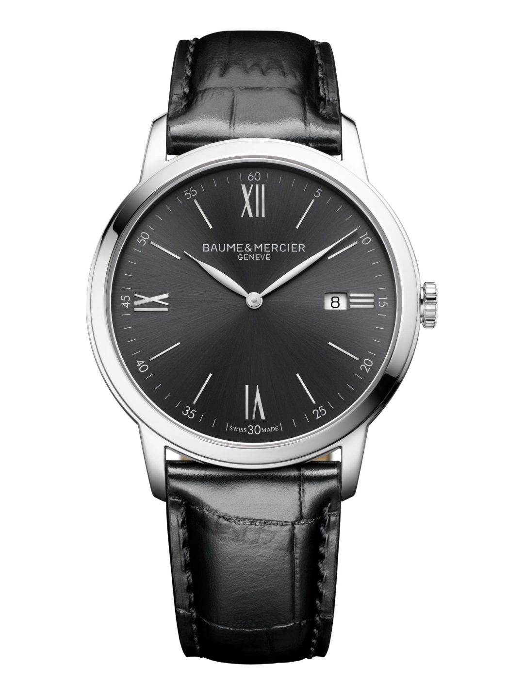 Montre acier 316L, mouvement Suisse à quartz, aiguilles feuilles et indexes rhodiés, cadran noir et chiffres romains, fonction date à 3H, verre saphir plat inrayable, étanche 5ATM sur un bracelet cuir de veau noir et une boucle ardillon acier.