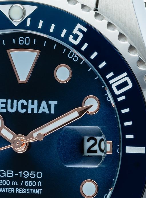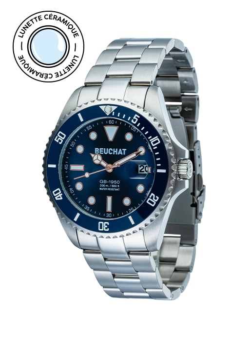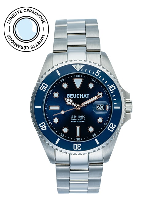 Montre acier 316L mouvement à quartz 3 aiguilles, dateur à 3H avec verre loupe, verre minéral, lunette bleue en céramique unidirectionnelle et cadran bleu, aiguilles et indexes luminescents et dorés, couronne et fond de boite vissés, diamètre de 44mm, épaisseur de 12mm, étanche 20ATM sur un bracelet en acier avec boucle déployante.