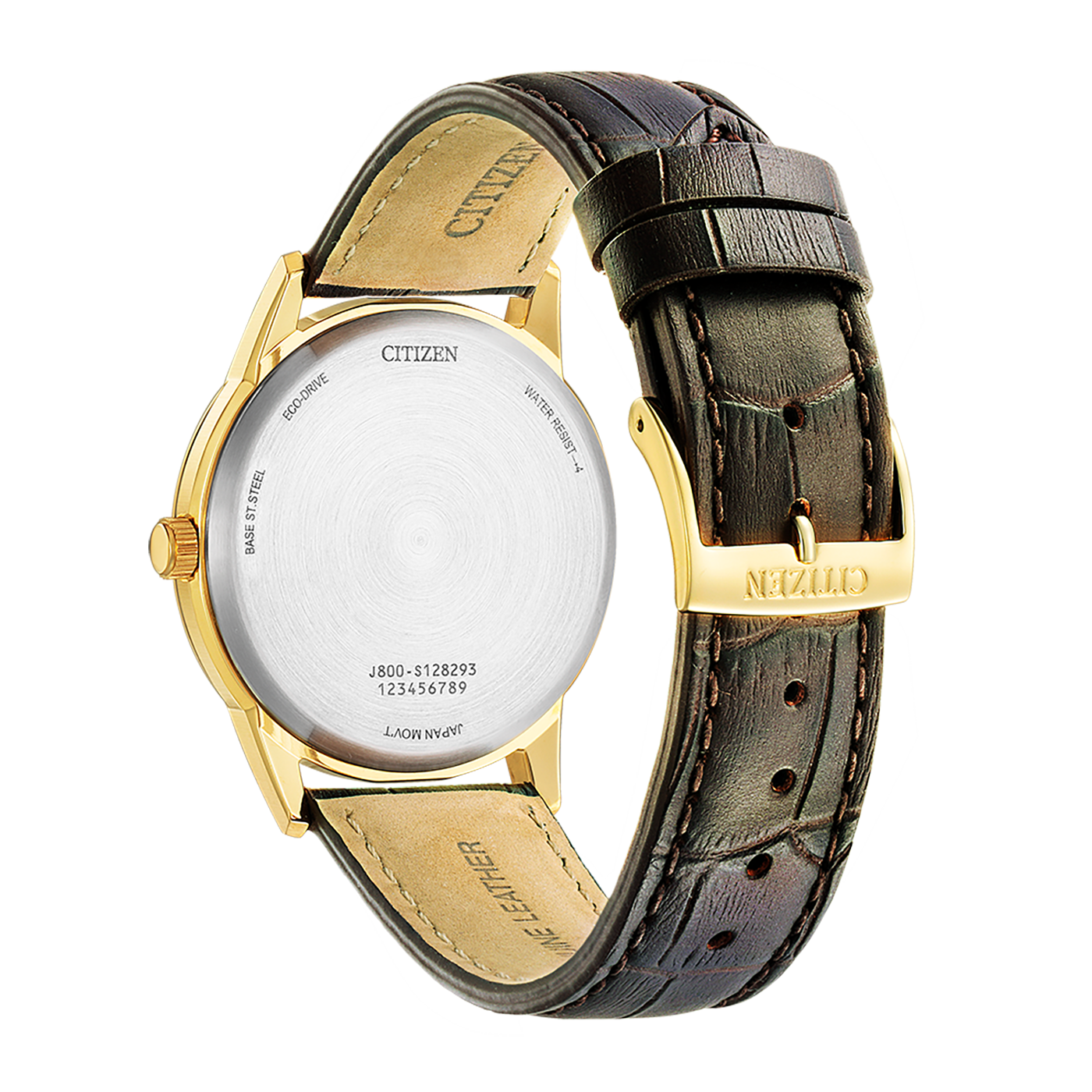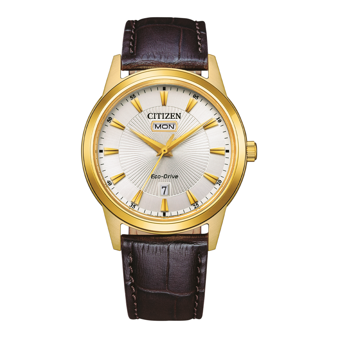 Montre en acier inoxydable 316L PVD doré, mouvement Eco-drive, quartz solaire Japonais J800 avec 240 jours de réserve de marche, minute, seconde et guichet date à 6 heure, étanche 3ATM, verre minéral, cadran blanc de 40mm avec indexes et aiguilles dorés sur un bracelet en cuir marron avec boucle ardillon dorée.