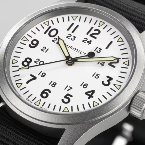 Petite mais tout autant puissante, la Khaki Field Mechanical est le compagnon idéal pour partir à l’aventure. Logé dans un boîtier de 38 mm en acier inoxydable, son cadran blanc mat présente de superbes index blancs et un revêtement Super-LumiNova® pour une lisibilité optimale. Grâce à son bracelet en NATO résistant, la Khaki Field Mechanical est une fidèle reproduction de son ancêtre des années 60, véritable hommage à l’héritage militaire d’Hamilton.