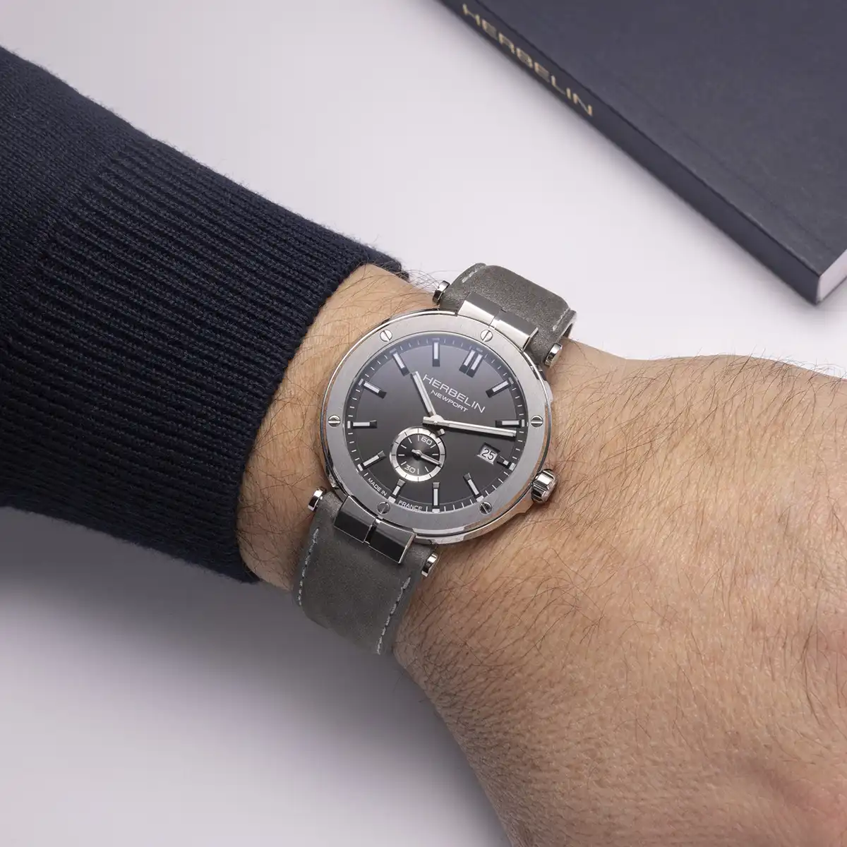 Alliant sobriété contemporaine et esprit marin, cette montre Newport incarne le savoir-faire horloger de HERBELIN à travers un design épuré et parfaitement équilibré. Son boîtier en acier inoxydable 316 L accueille un cadran gris brossé vertical, dont les reflets subtils apportent profondeur et modernité à l’ensemble. Animée par un mouvement quartz suisse Ronda, cette Newport offre une lecture claire des heures, minutes et de la date, complétée par une petite seconde placée avec précision. Les index appliqués et les aiguilles contrastées renforcent la lisibilité, tandis que le verre saphir traité antireflet protège durablement le cadran. Étanche jusqu’à 100 mètres, cette montre accompagne aussi bien le quotidien que les escapades nautiques. Son bracelet en cuir gris, fermé par une boucle traditionnelle, souligne le caractère élégant et masculin du modèle. Une Newport au style affirmé, pensée pour les amateurs de montres au design structuré et intemporel.