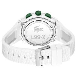 Montre TR90 Lacoste: collection LC33 blanc 2011364 mouvement anadigital à quartz chrono, alarme et lumière sur un bracelet en silicone.
