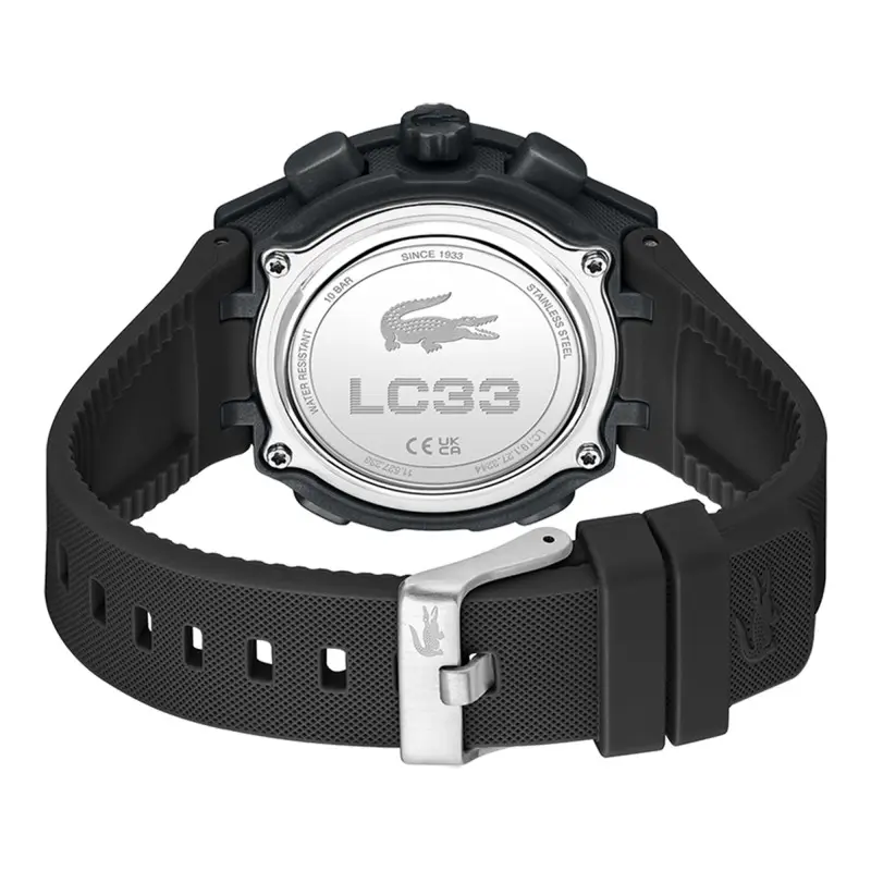 Montre Lacoste: collection LC33 Noir 2001434 mouvement anadigital à quartz chrono, alarme et lumière sur un bracelet en silicone.