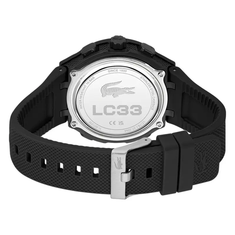 Montre Lacoste: collection LC33 noir 2011435 mouvement anadigital à quartz chrono, alarme et lumière sur un bracelet en silicone.