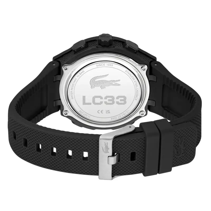 Montre Lacoste: collection LC33 noir 2011447 mouvement anadigital à quartz chrono, alarme et lumière sur un bracelet en silicone.