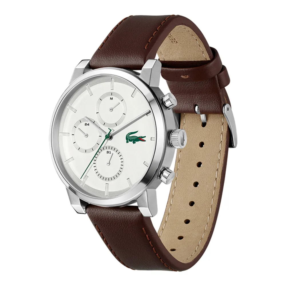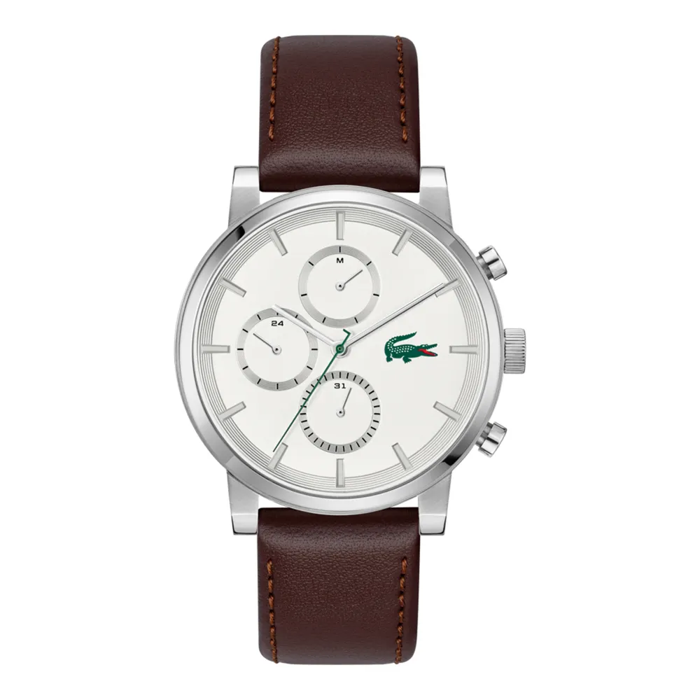 Montre Lacoste de la collection Replay, mouvement quartz, multifonction, composée d’un boîtier acier de 44 mm, d’un cadran argenté sur bracelet cuir marron. Etanche 50m.