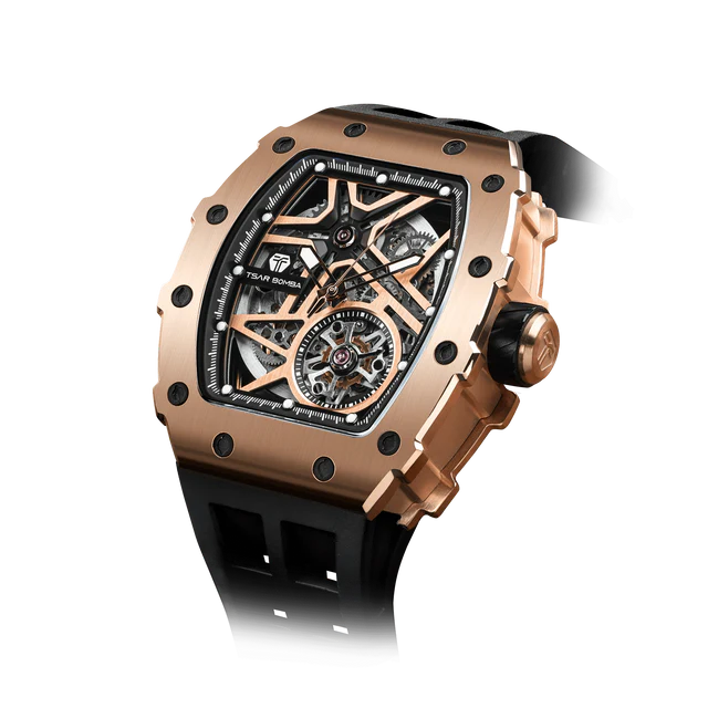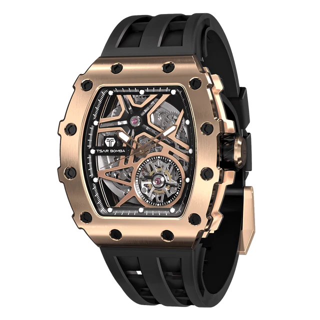 Montre, dimensions: 43x50.5x15.5, verre saphir, mouvement Automatique Miyota 82SO. Un cadran squeletté est une fenêtre captivante sur le fonctionnement interne de votre Tsar Bomba. En révélant habilement les rouages, les ponts et les roues d'équilibre, nos designers de montres vous permettent d'apprécier pleinement l'ingénierie horlogère et l'art qui entrent dans chaque Tsar Bomba. Évalué à 5 ATM ou 50 mètres (150 pieds), ce qui permet une performance étanche sans souci sous la pluie et en nageant. AlphaLuminex de Tsar Bomba, de haute qualité et exclusif, offre une visibilité exceptionnelle du cadran la nuit, vous permettant de lire rapidement l'heure même dans des conditions d'obscurité totale. Bracelet caoutchouc silicone est très résistant à la déchirure, ce qui signifie que votre bracelet de montre survivra facilement à votre style de vie actif. Le caoutchouc silicone est également hypoallergénique et confortable à porter toute la journée, quel que soit votre type de peau et boucle ardillon.
