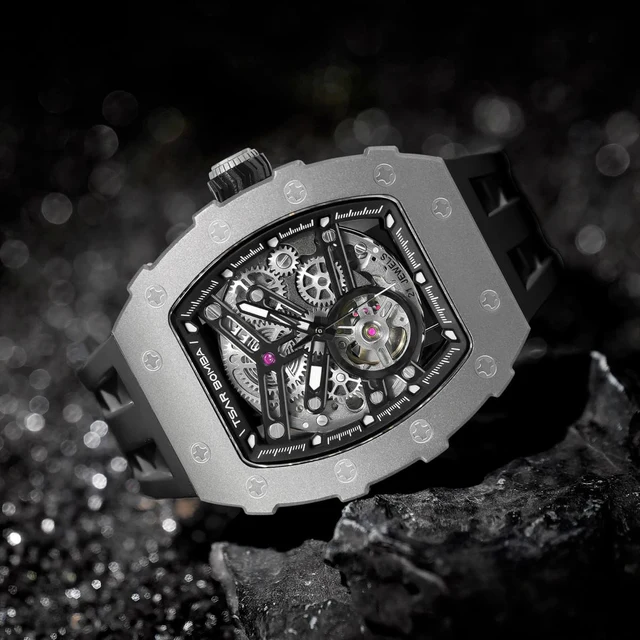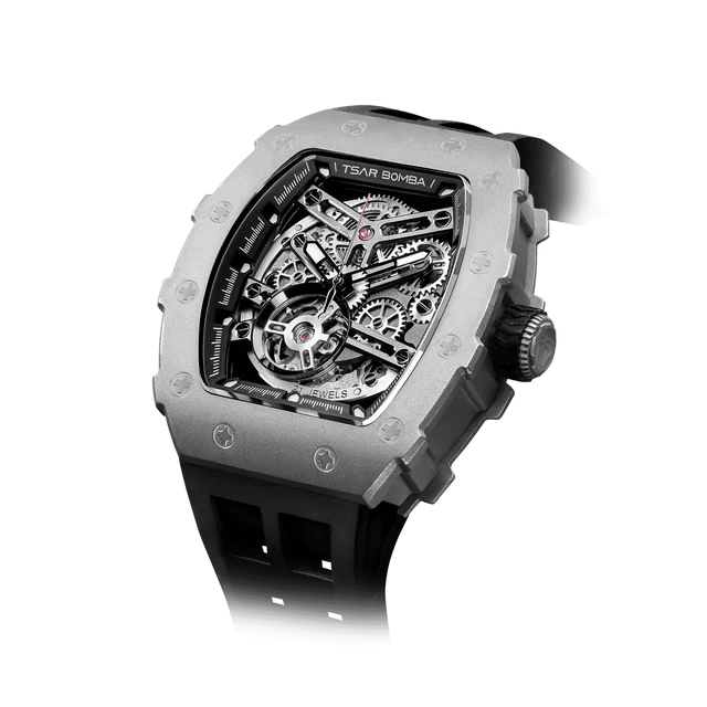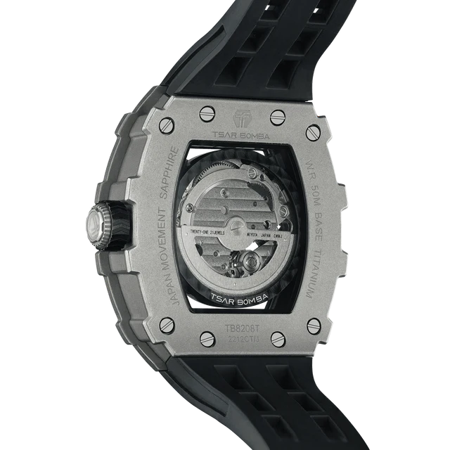 Montre acier 316L et lunette titane, dimensions: 43x50.5x15.5, verre saphir, mouvement Automatique Miyota 82SO. Un cadran squeletté est une fenêtre captivante sur le fonctionnement interne de votre Tsar Bomba. En révélant habilement les rouages, les ponts et les roues d'équilibre, nos designers de montres vous permettent d'apprécier pleinement l'ingénierie horlogère et l'art qui entrent dans chaque Tsar Bomba. Évalué à 5 ATM ou 50 mètres (150 pieds), ce qui permet une performance étanche sans souci sous la pluie, dans la douche et en nageant. AlphaLuminex de Tsar Bomba, de haute qualité et exclusif, offre une visibilité exceptionnelle du cadran la nuit, vous permettant de lire rapidement l'heure même dans des conditions d'obscurité totale. Bracelet caoutchouc silicone est très résistant à la déchirure, ce qui signifie que votre bracelet de montre survivra facilement à votre style de vie actif. Le caoutchouc silicone est également hypoallergénique et confortable à porter toute la journée, quel que soit votre type de peau et boucle ardillon.