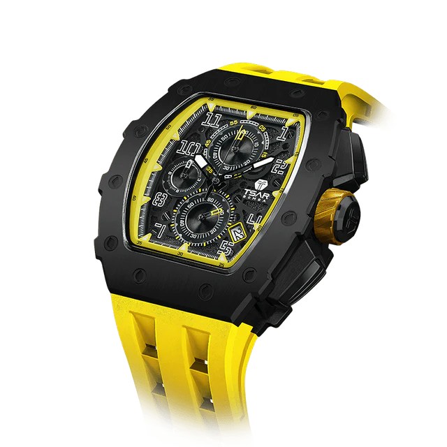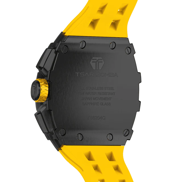 Montre acier 316L PVD noir, dimensions: 40x50.5x15.5, verre saphir, mouvement Seïko à quartz offrant une fonction de chronographe intégré (chronomètre) ainsi que la date et l'heure, le cadran est un parfait mélange de forme et de fonction. Évalué à 5 ATM ou 50 mètres (150 pieds), ce qui permet une performance étanche sans souci sous la pluie, dans la douche et en nageant. AlphaLuminex de Tsar Bomba, de haute qualité et exclusif, offre une visibilité exceptionnelle du cadran la nuit, vous permettant de lire rapidement l'heure même dans des conditions d'obscurité totale. Bracelet en silicone jaune et boucle ardillon en PVD noir.