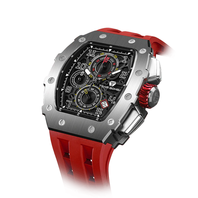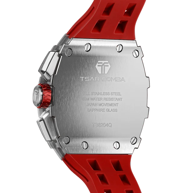 Montre acier 316L, dimensions: 40x50.5x15.5, verre saphir, mouvement Seïko à quartz offrant une fonction de chronographe intégré (chronomètre) ainsi que la date et l'heure, le cadran est un parfait mélange de forme et de fonction. Évalué à 5 ATM ou 50 mètres (150 pieds), ce qui permet une performance étanche sans souci sous la pluie, dans la douche et en nageant. AlphaLuminex de Tsar Bomba, de haute qualité et exclusif, offre une visibilité exceptionnelle du cadran la nuit, vous permettant de lire rapidement l'heure même dans des conditions d'obscurité totale. Bracelet en silicone rouge et boucle ardillon acier.